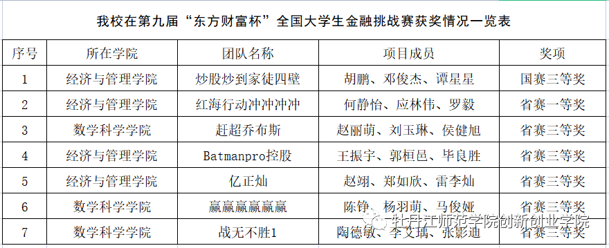 近日,第九届“东方财富杯”全国老员工金融挑战赛圆满结束。经过激烈比拼,最终公司荣获省赛一等奖2项,三等奖5项。公司由经济与管理公司胡鹏、邓俊杰、谭星星组成的团队,在数学科学公司教师李岩的指导下荣获国赛三等奖。