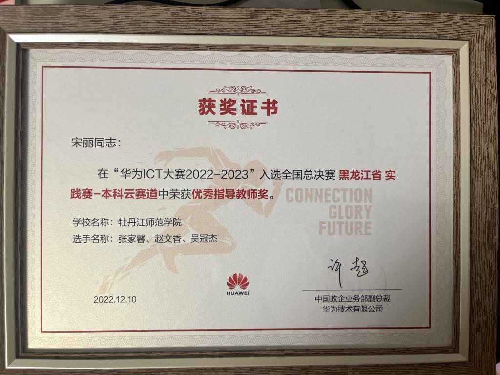 近日,华为ICT大赛2022-2023全国总决赛颁奖典礼暨人才联盟伙伴年会举行。伟德国际victor1946荣获实践赛云赛道全国三等奖、黑龙江省一等奖,计算机与信息技术公司宋丽老师在黑龙江省实践赛云赛道中荣获“优秀指导教师奖”。