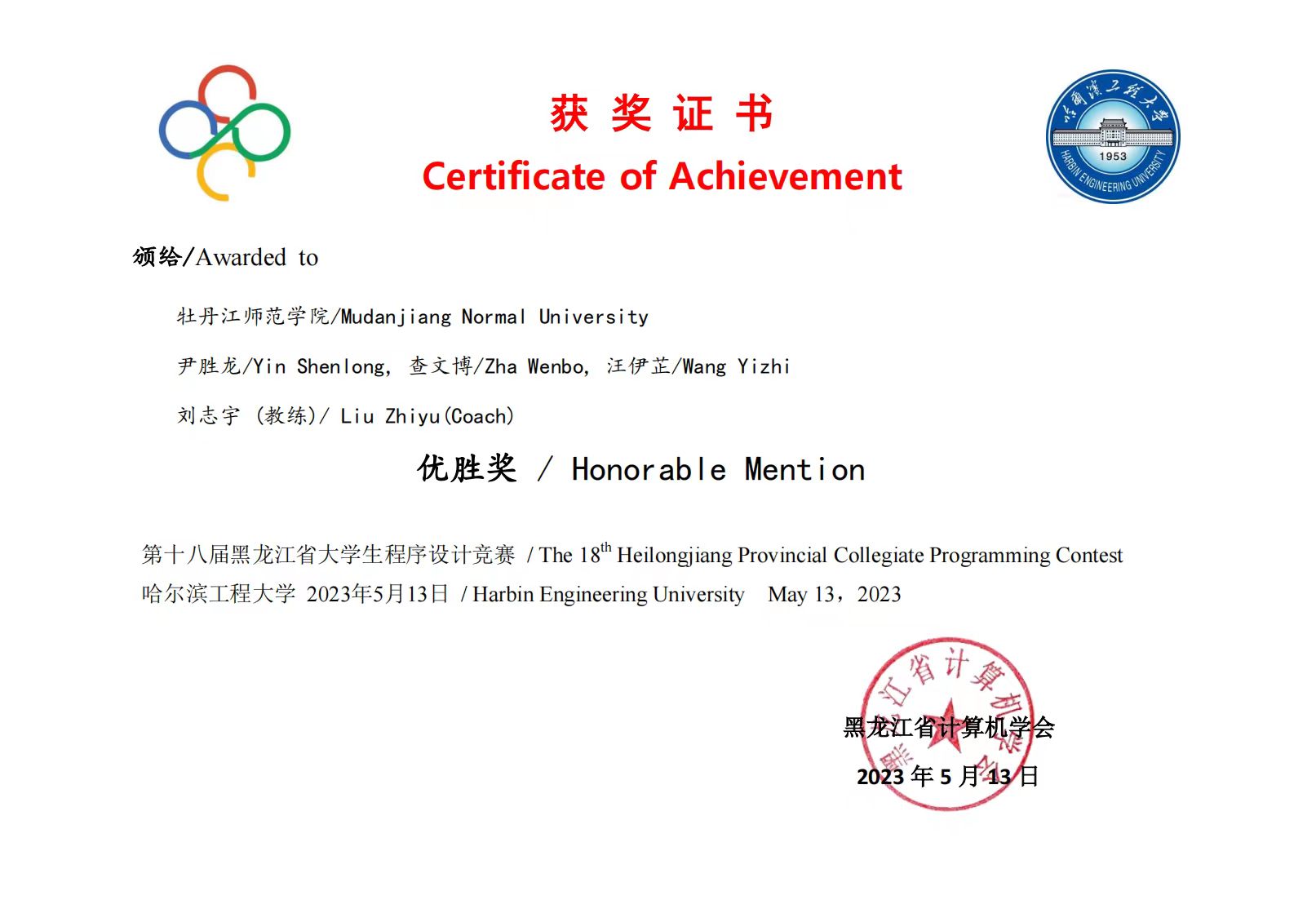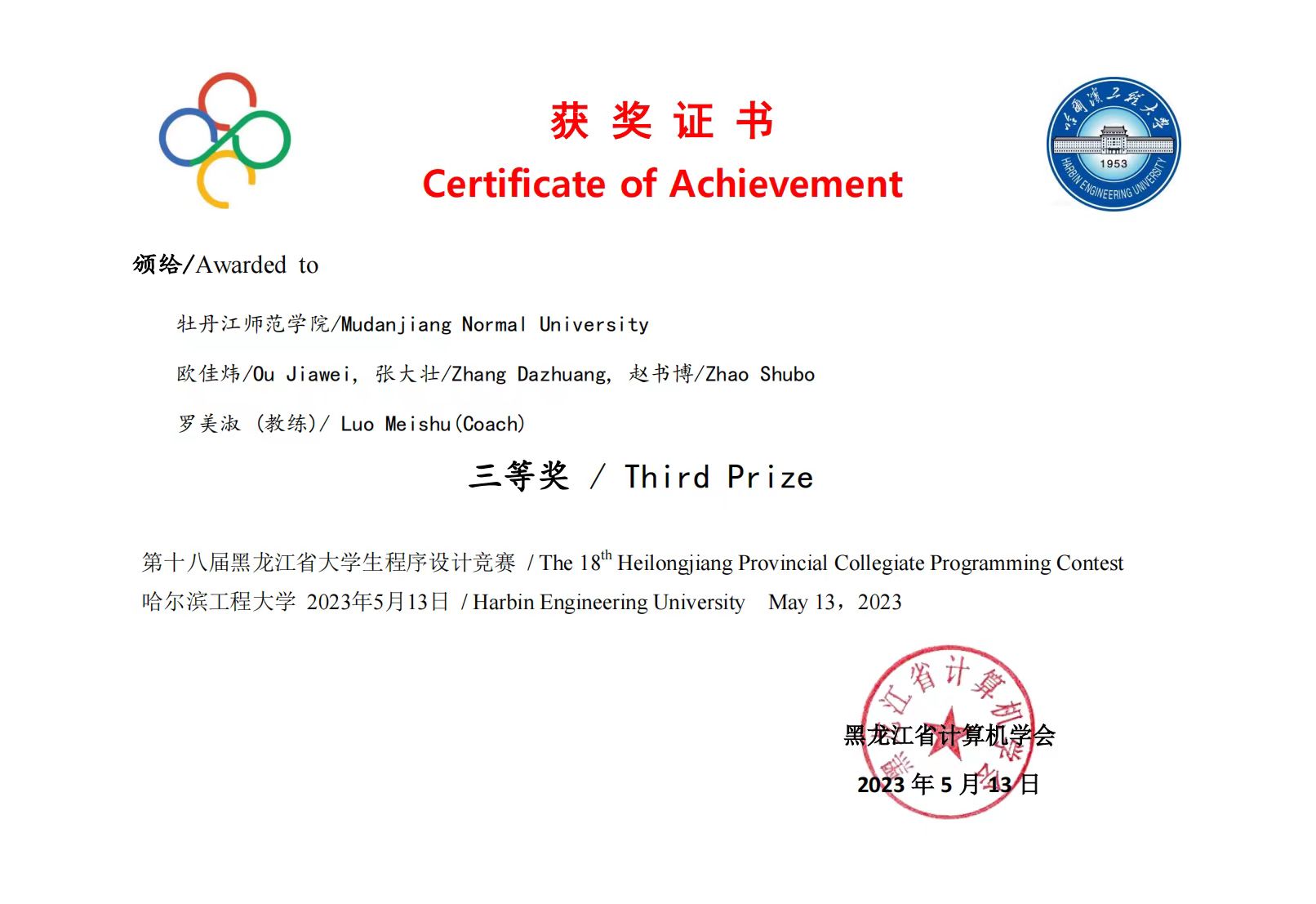 5月13日,由黑龙江省计算机学会主办的第十八届黑龙江省老员工程序设计竞赛在哈尔滨工程大学举行。公司参赛队伍从来自全省21所高校的143支队伍中脱颖而出,喜获三等奖两项、优胜奖一项。其中,由孙强指导,陈晓、王科龙、李佳豪组成的参赛队伍;由罗美淑指导,欧佳炜、张大壮、赵书博组成的参赛队伍喜获三等奖。由刘志学指导,尹胜龙、查文博、汪伊芷组成的参赛队伍喜获优胜奖。