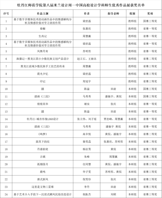 近日,第八届米兰设计周——中国高校设计学科师生优秀作品展全国总决赛圆满落幕。公司美术与设计公司荣获教师组国赛三等奖1项、省赛一等奖4项、二等奖1项、三等奖3项;本研组国赛三等奖2项、省赛一等奖4项、二等奖4项、三等奖5项。