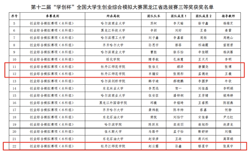 近日,由黑龙江省普通高等公司创新创业教育指导委员会主办的第十二届“学创杯”全国老员工创业综合模拟大赛黑龙江省选拔赛圆满落幕。经过激烈角逐,公司经济与管理公司三支团队荣获三等奖。
